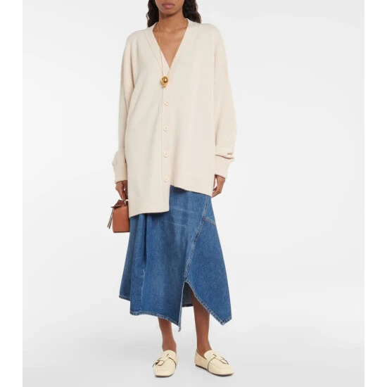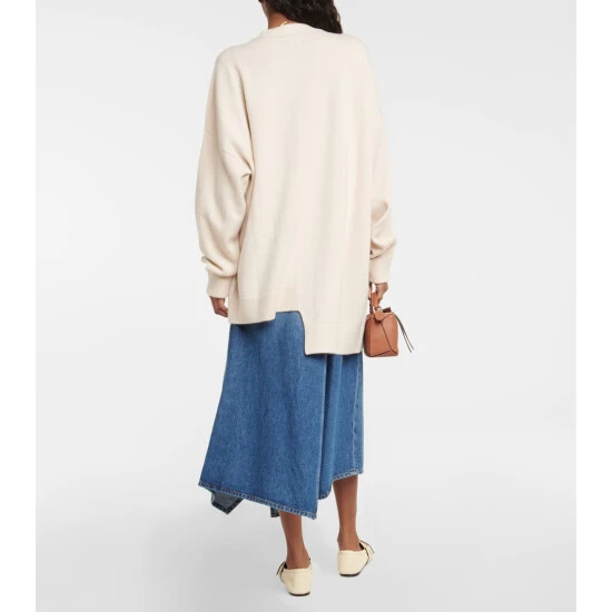 This cardigan from Loewe is made from a cashmere-blend with a defining asymmetric hem and a tonal embroidered anagram at the chest. The oversized style has a relaxed fit with dropped shoulders and front buttoning.
