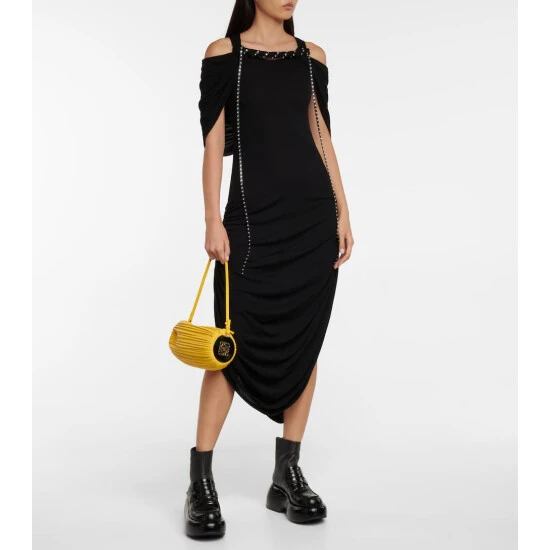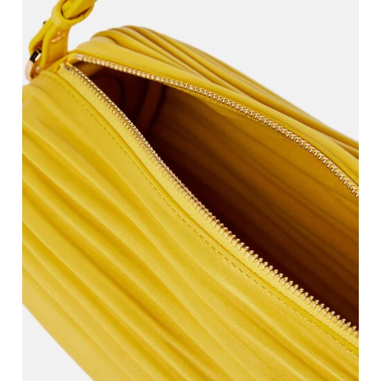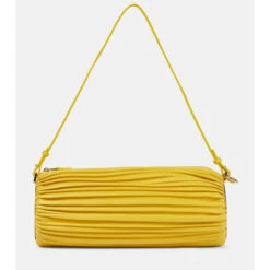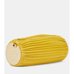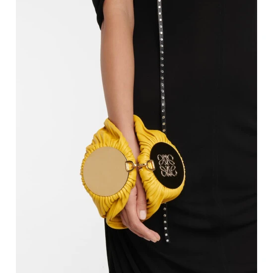 Loewe might have just released the fashion crowd’s latest bag favorite. A design like no other, it’s crafted from pleated yellow nappa leather that’s pliable enough to convert to a ruched oversized bracelet when not slung across the shoulder with the attachable strap.