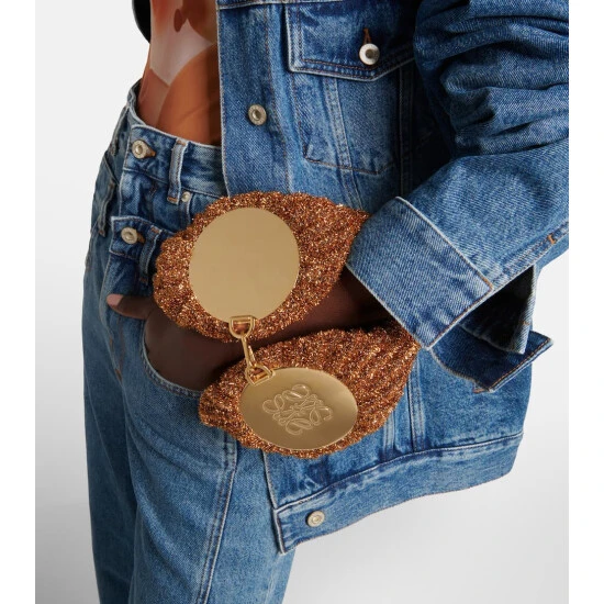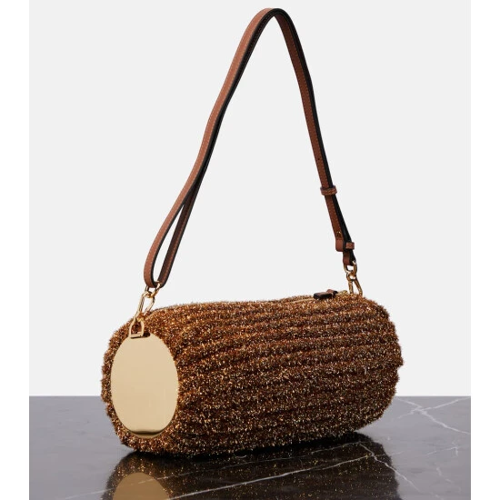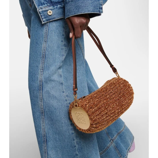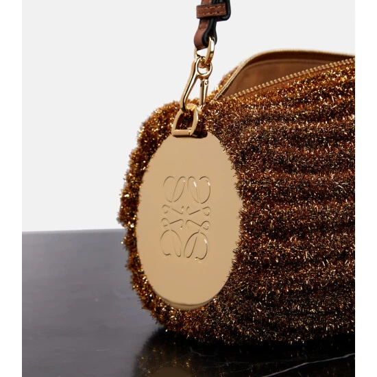 Loewe’s Bracelet bag is the fashion crowd’s latest favorite. The tubular design is made from pleated bronze Lurex® for a fuzzy finish with anagram plaques on each end and features a detachable leather shoulder strap.