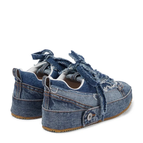 We’re intrigued by the deconstructed design of these Loewe sneakers. From the raw-edged denim paneling to the metal rivets and yellow topstitching, it appears as if they’re crafted from a pair of repurposed blue jeans.