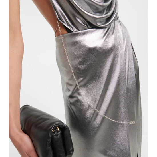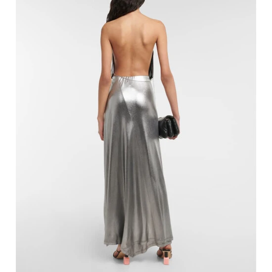 Add Loewe’s unique personality to your edit in the form of this laminated asymmetric split maxi skirt. Made from a soft, silver-coated jersey, the high-rise design drapes effortlessly, creating elegance and movement.