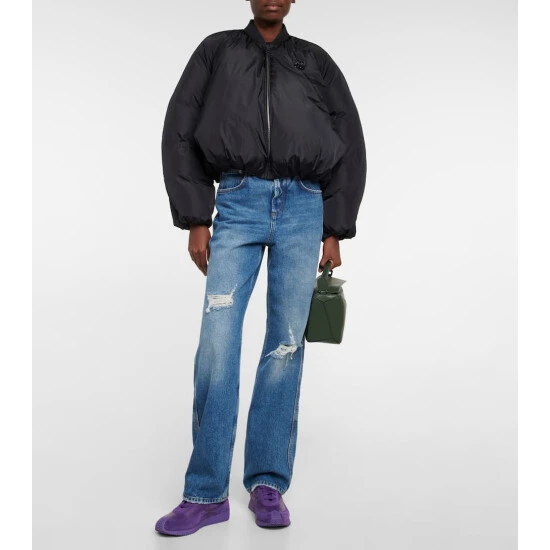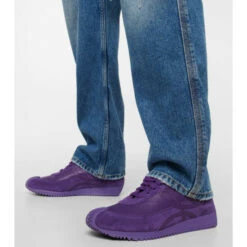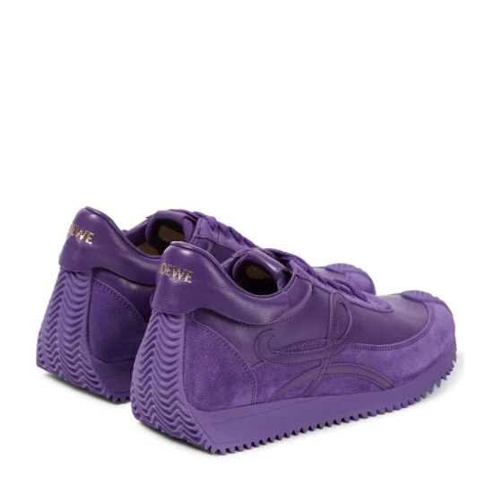 The Flow Runner lace-up leather sneakers from Loewe feature a rubber sole and wave design that curves around to the back of the heel. The gold logo on the back adds a tonal accent.