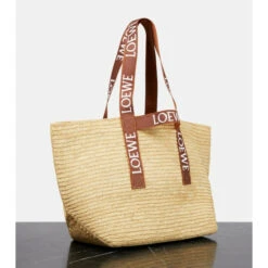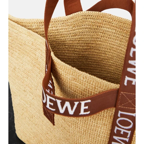 Suspended from branded double top handles, Loewe’s Fold tote is made from raffia and sports a roomy interior.