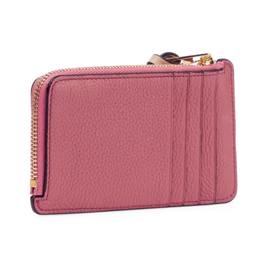A stylish and compact option for keeping your essentials, this coin and card holder from Loewe has four card slots and a zipped compartment. It’s made from grained leather in brown and pink.