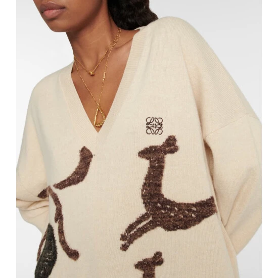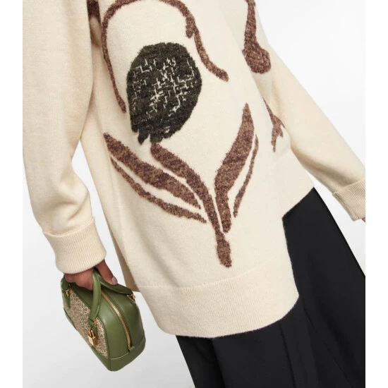 The Anagram logo was designed by the Spanish artist Vicente Vela as a quadruple-L insignia that now lends instant recognition to any Loewe piece. Here, it is embroidered on this intarsia wool-blend asymmetric sweater.