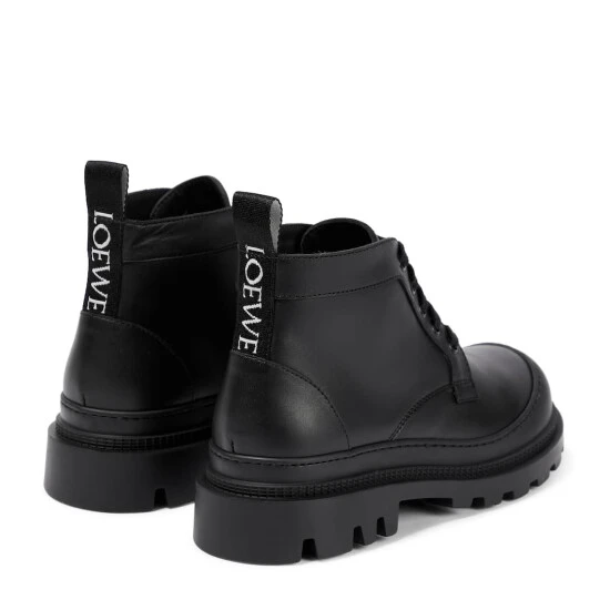 All of Loewe’s leather goods are handcrafted in Spain, reflecting the house’s centuries-long expertise and artisanal methods. These leather ankke boots are instantly-recognizable with extended branded grosgrain pull tabs to the heels.