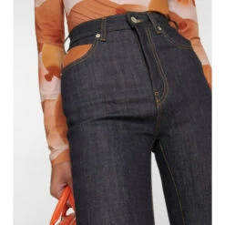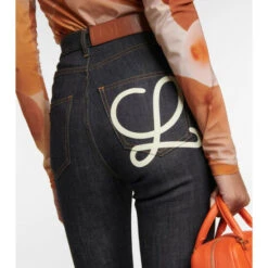 Loewe integrates its signature logo print with a touch of trademark leather for this slim-leg style. Made from cotton denim, these jeans have classic 5-pocket styling, tobacco topstitching, and a contrast patch to one hip.