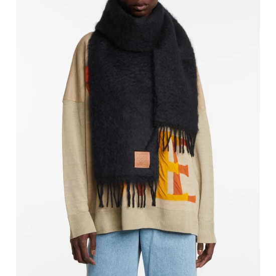 Equip yourself for decreasing temperatures with this oversized black scarf from LOEWE. Made from a tactile mohair and wool-blend, this accessory is finished with exaggerated tassel detailing. Layer yours over neutral and color-block ensembles in equal measure – ensuring the label’s leather Anagram patch stays on full display.