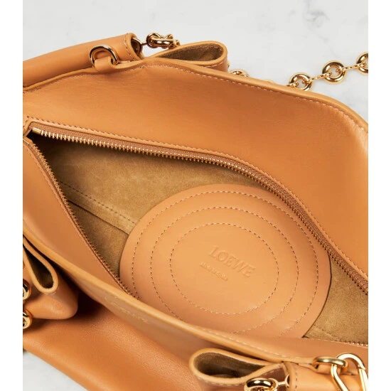 A decade after the launch of Loewe’s original Paseo bag, this new iteration is streamlined and elongated in a contemporary shape. The Small tote bag is made from smooth, folded nappa leather with an interwoven golden chain strap.