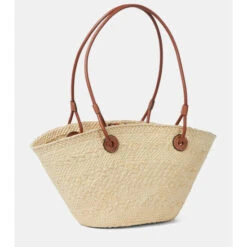 This small beige basket bag from Loewe’s Paula’s Ibiza collection is woven in Colombia from iraca palm by female artisans from the Corporación Oficio y Arte NGO; a collective that provides opportunities for their financial independence. Suspended from short leather top handles, the Small design is embroidered with the label’s iconic Anagram logo on its front face.