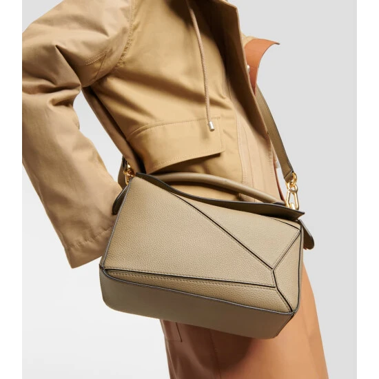 Loewe’s best-known bag family, the Puzzle, welcomes a new member: this muted green Small shoulder bag. Demonstrating what happens when expert craftsmanship and innovative design come together, it’s made by artisans in the brand’s Madrid atelier from geometrically cut, asymmetrically set panels of grained calf leather. For clever styling, it can be carried in five ways: over the shoulder, across the body, on the back, in-hand, or, because the buttery leather is easily manipulated, as a clutch.