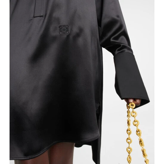 Desk-to-dinner transitioning is as easy as styling this shirt dress from Loewe. It’s made from lustrous silk satin for a relaxed, oversized fit with exaggerated cuffs, dropped shoulders, a stepped hem, and mid-length button placket.