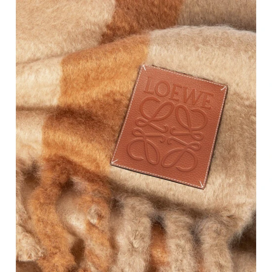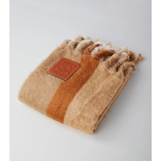 Crafted from a blend of mohair wool, wool and nylon, this striped and multicolored blanket from Loewe Home has fringed edges and a leather logo plaque at one side.
