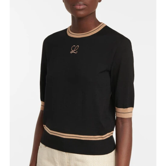 This black LOEWE sweater is a sophisticated summer knit. Made in Italy from a lightweight wool, it has a straight silhouette with a slightly cropped hem that hits the hips. It’s trimmed in beige stripes and embroidered with the label’s L monogram in metallic threading.