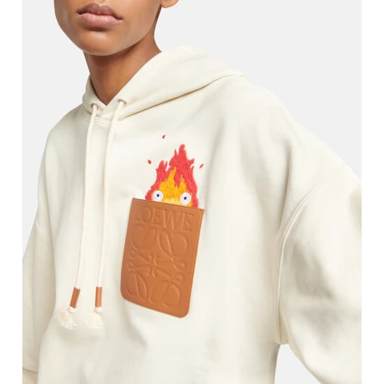Loewe and Studio Ghibli collaborate once again with a new capsule that celebrates craft and imagination. The featured film, Howl’s Moving Castle, is full of unforgettable characters like the fire demon Calcifer – whose embroidered likeness peeks out from a leather Anagram patch on this cotton hoodie.