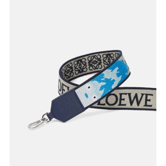 A tribute to the film Howl’s Moving Castle, the latest collaboration between Loewe and Studio Ghibli celebrates a shared love of craft and imagination. This detachable jacquard bag strap features logo lettering and the beloved character Calcifer on one side, and a repeat Anagram pattern on the other. It has leather trims and is fully adjustable through a hardware slider.